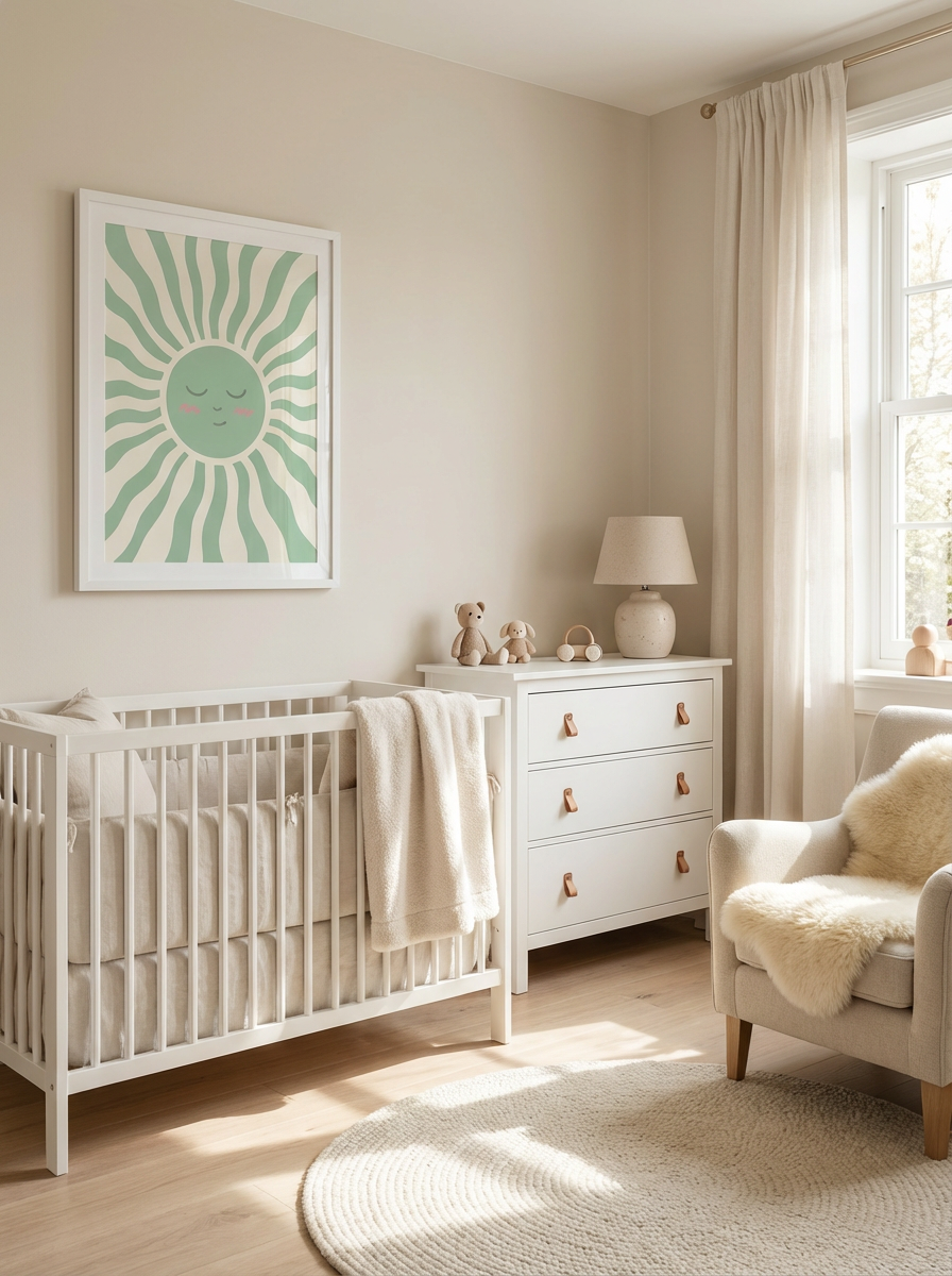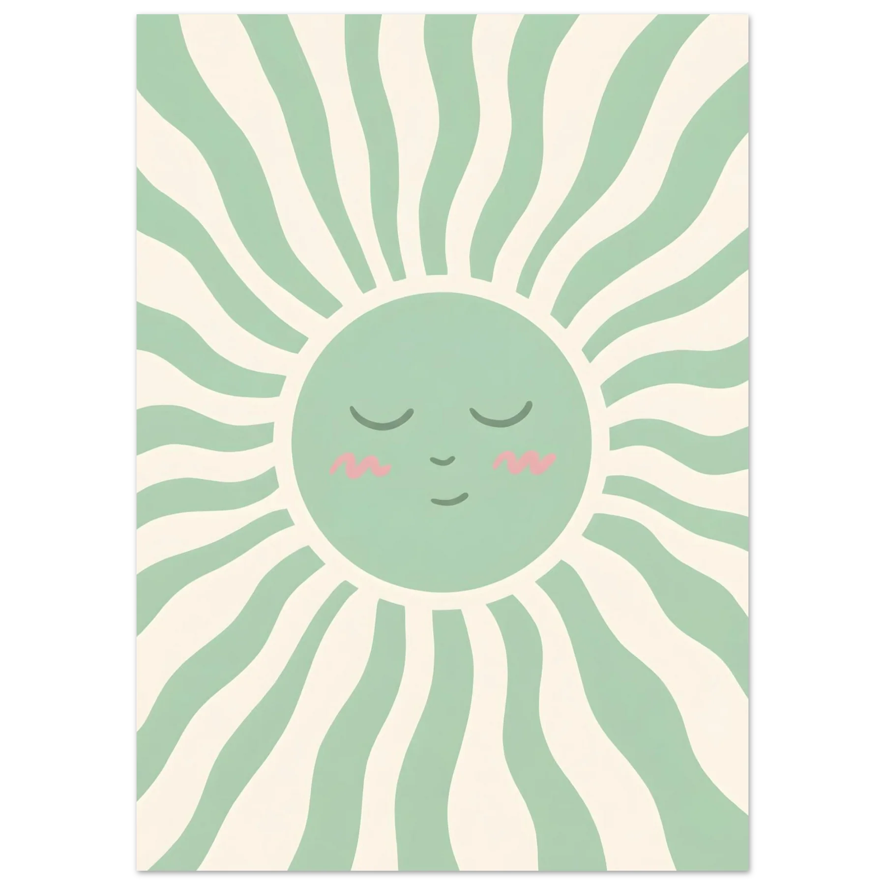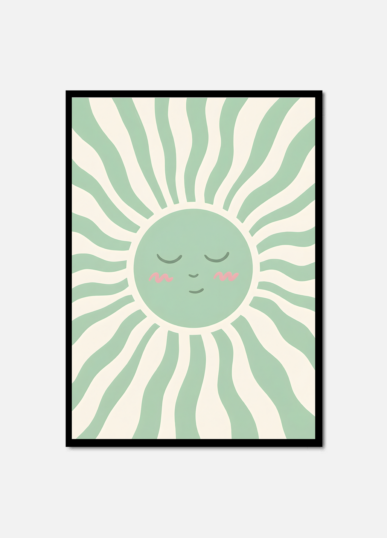 En charmig barnposter med en glatt leende sol i mjuka toner av pastellgrönt, placerad mot en lugn beige bakgrund med inslag av rosa. De långa, lekfulla solstrålarna skapar ett harmoniskt och tryggt uttryck som sprider glädje i rummet. Postern ger en ombonad och varm känsla och passar perfekt för att skapa en rofylld, glad atmosfär i barnets rum.