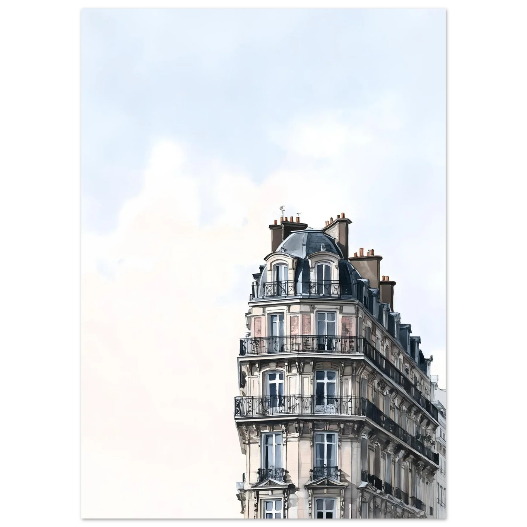 En poetisk tolkning av Paris där en ensam fasad möter en himmel fylld av ljus och mjuka moln. Akvarellens penseldrag fångar både elegans och enkelhet, som en stilla hyllning till stadens själ. Här framträder de öppna fönstren, de smala balkongerna och de karakteristiska taken med sina skorstenar, allt inramat av en känsla av ro och tidlöshet. Motivet blir mer än en bild – det blir en stillsam påminnelse om Paris magi.