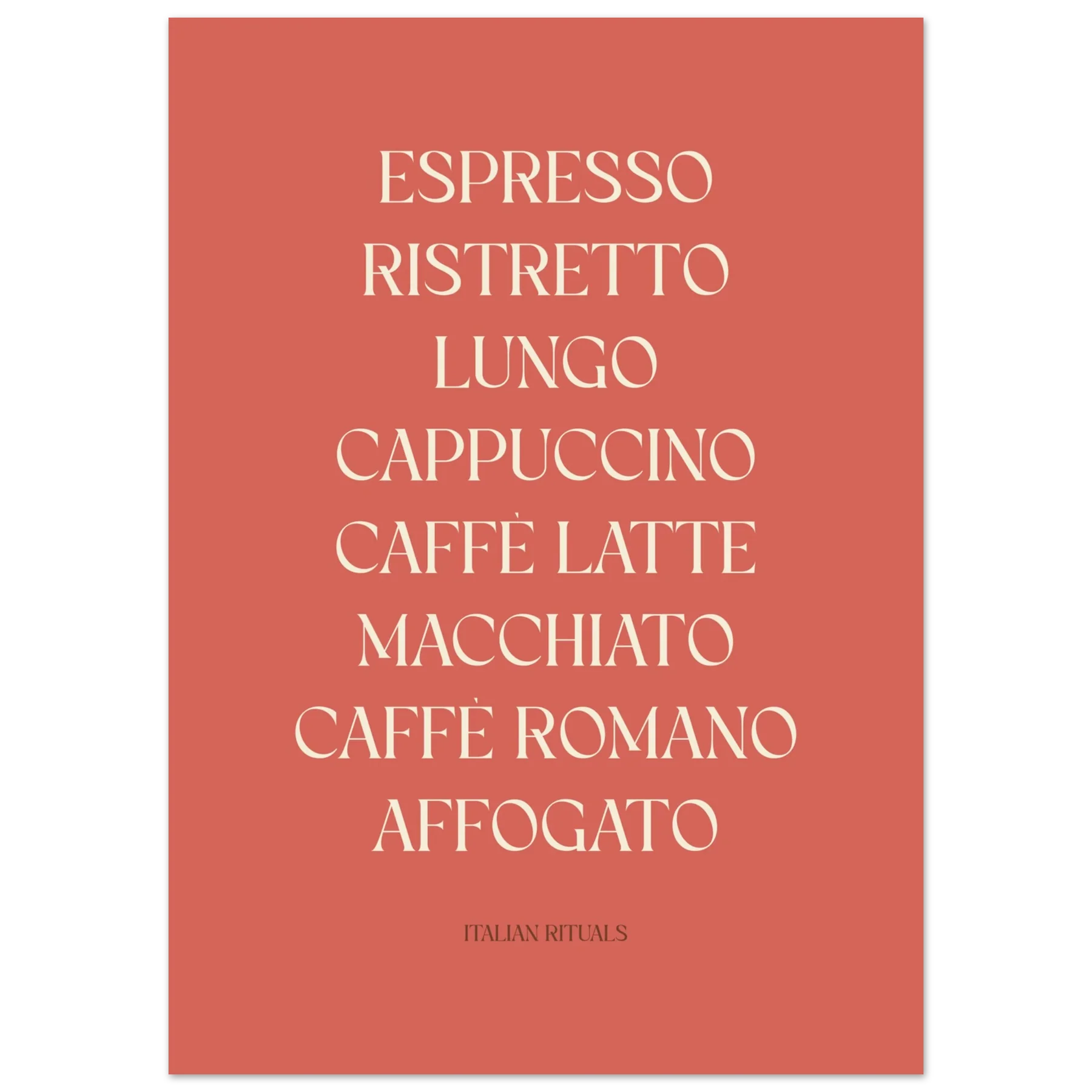 Bring the warmth of a classic Italian café into your home with Italian Rituals. This hand-lettered poster or canvas showcases 8 iconic Italian coffee styles, from Espresso and Ristretto to Cappuccino and Affogato. The warm terracotta background and creamy off-white text create a cozy, inviting atmosphere, perfect for your kitchen, living room, or office. The subtle olive green accent adds a touch of Italian charm, making it more than decoration – it’s a daily reminder to slow down, savor life, and enjoy every coffee moment.