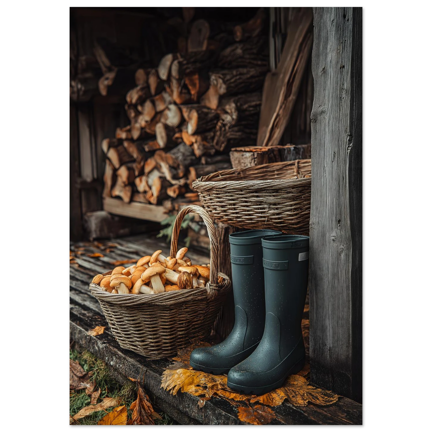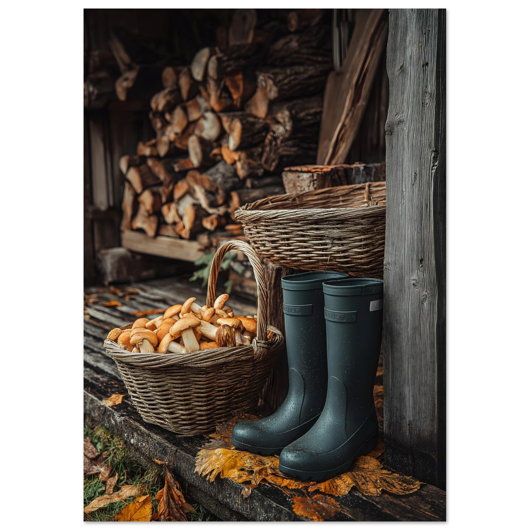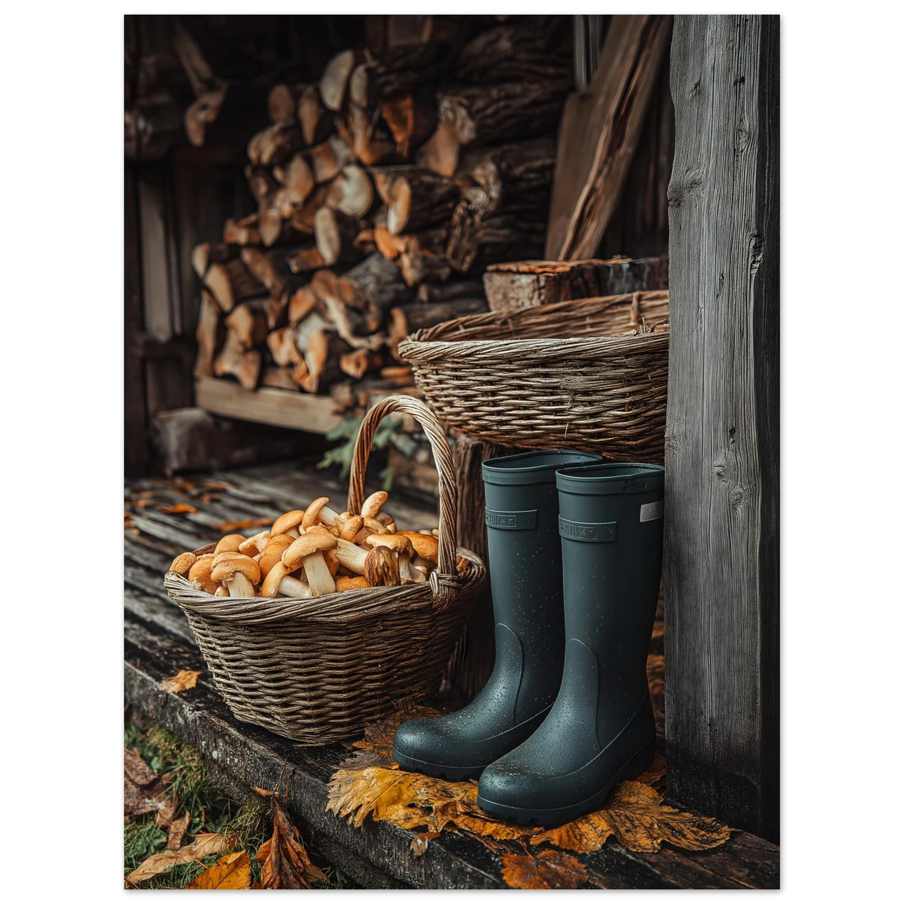 Hösten samlas i små detaljer: löv på marken, svampar i korgen och stövlar som väntar på nästa promenad genom skogen.
