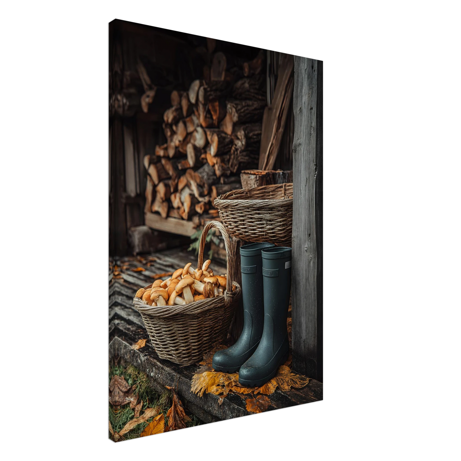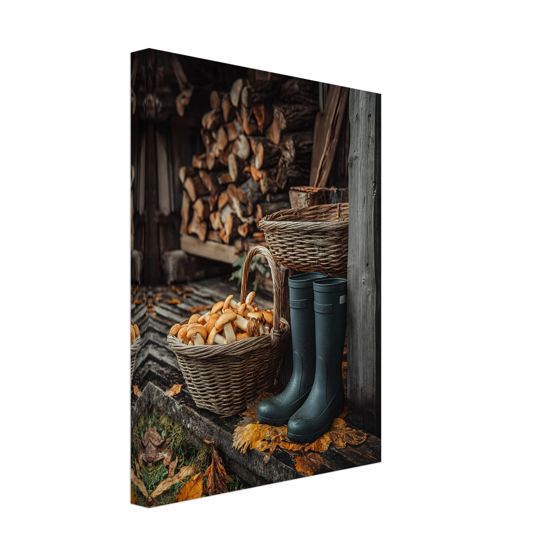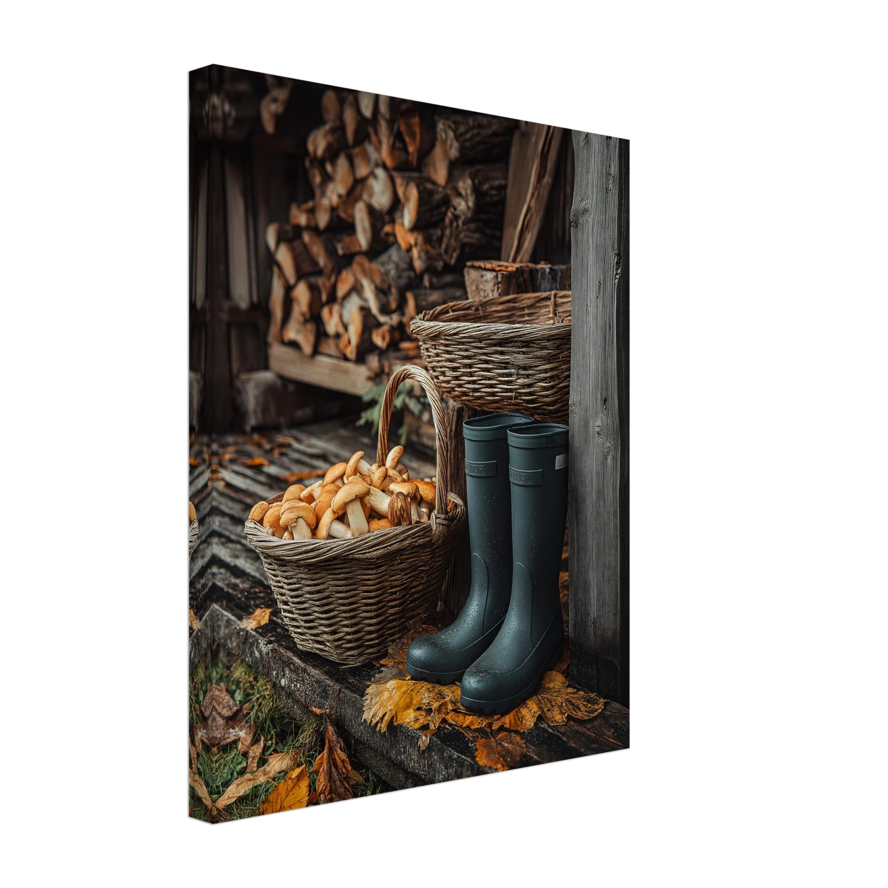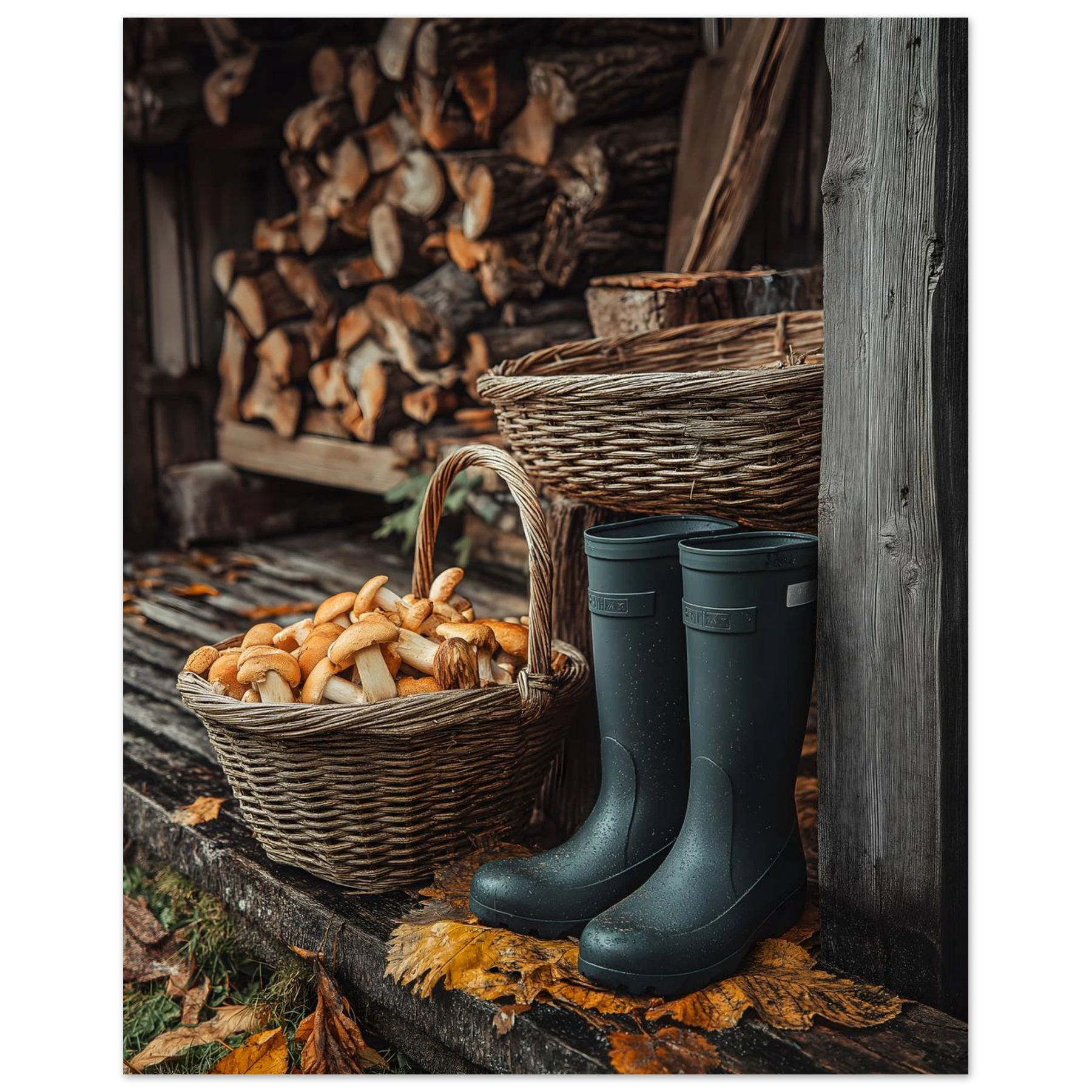 Hösten samlas i små detaljer: löv på marken, svampar i korgen och stövlar som väntar på nästa promenad genom skogen.