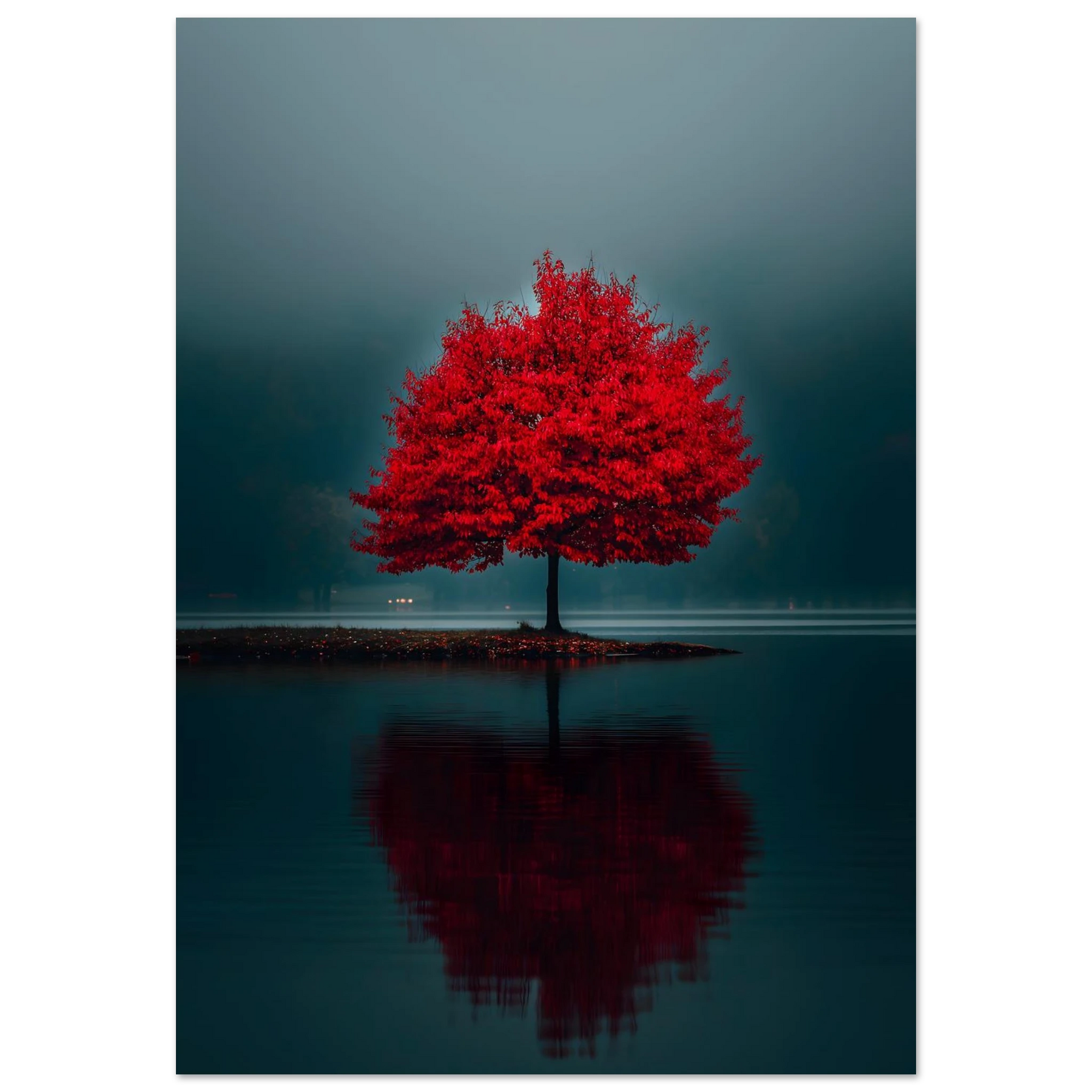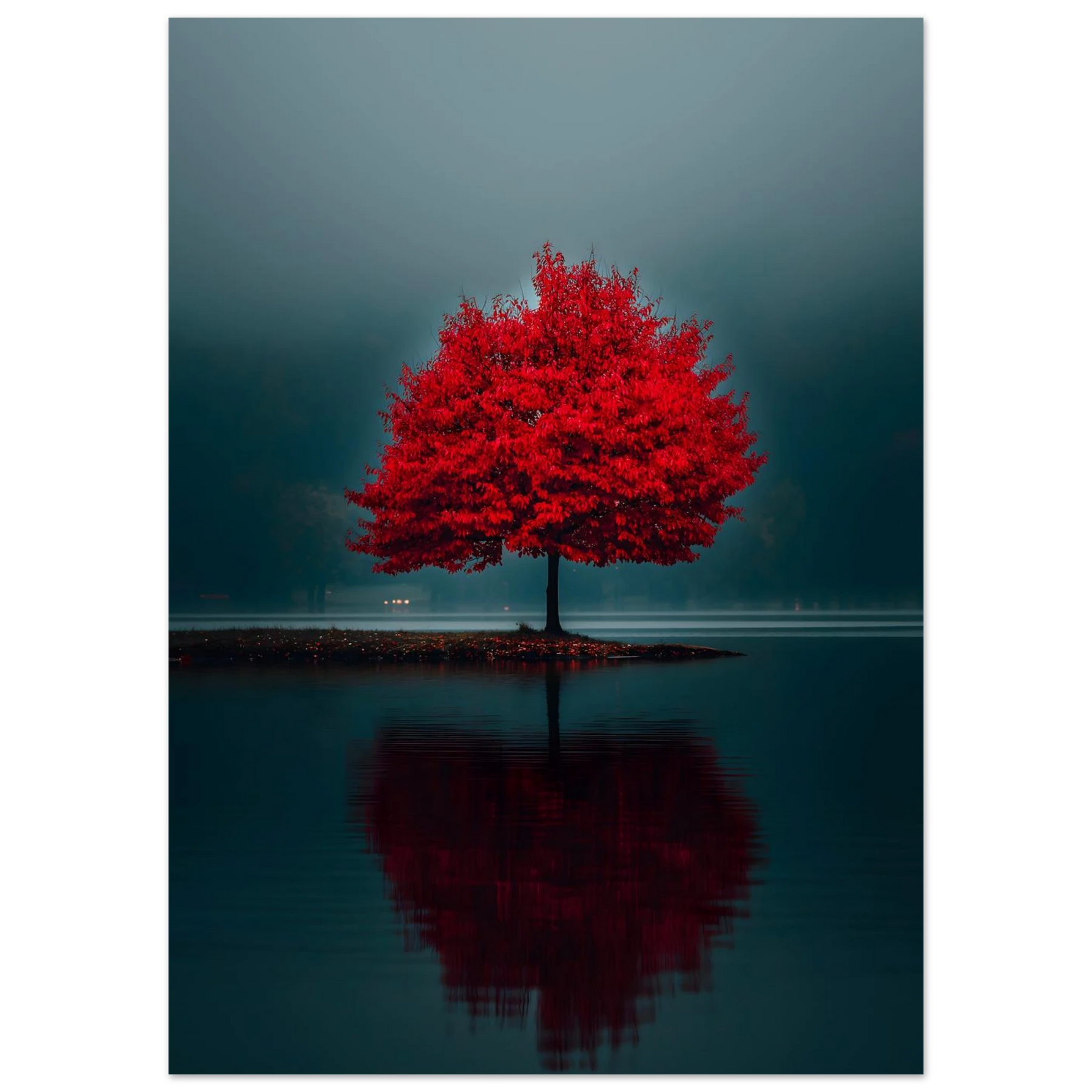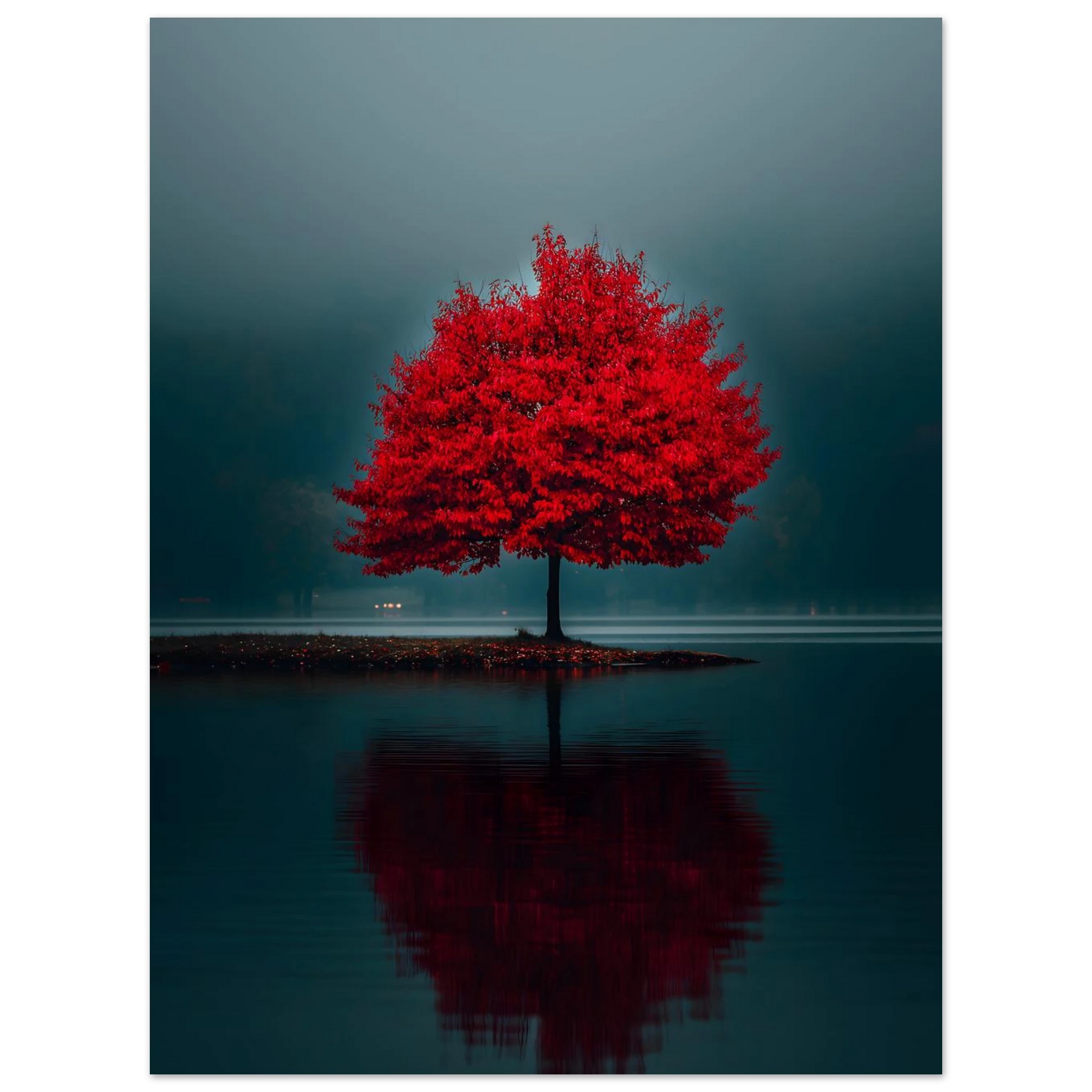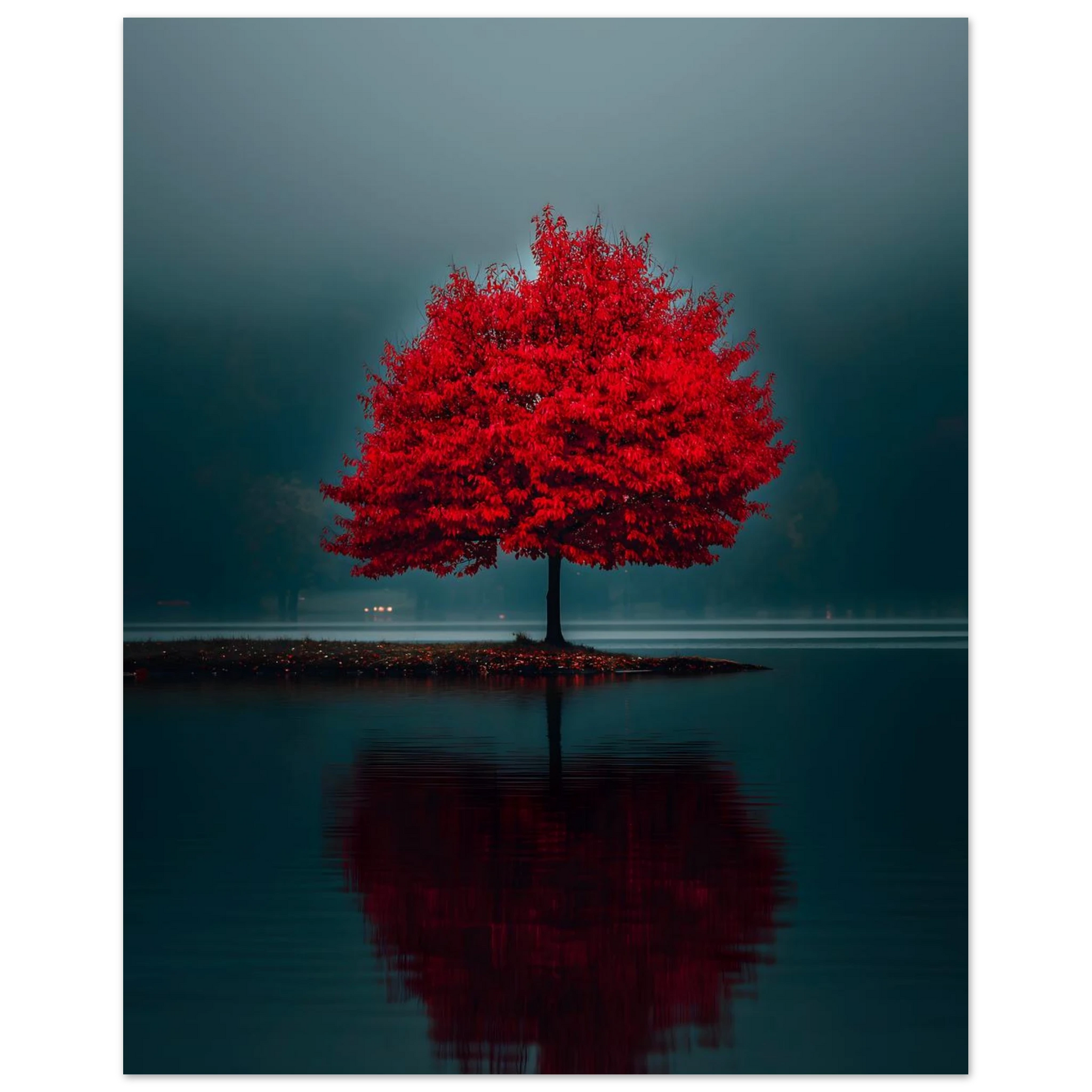Ett rött träd i höstens dimma fångar blicken. Färgen lyser upp det mörka och skapar en känsla av både ensamhet och skönhet.