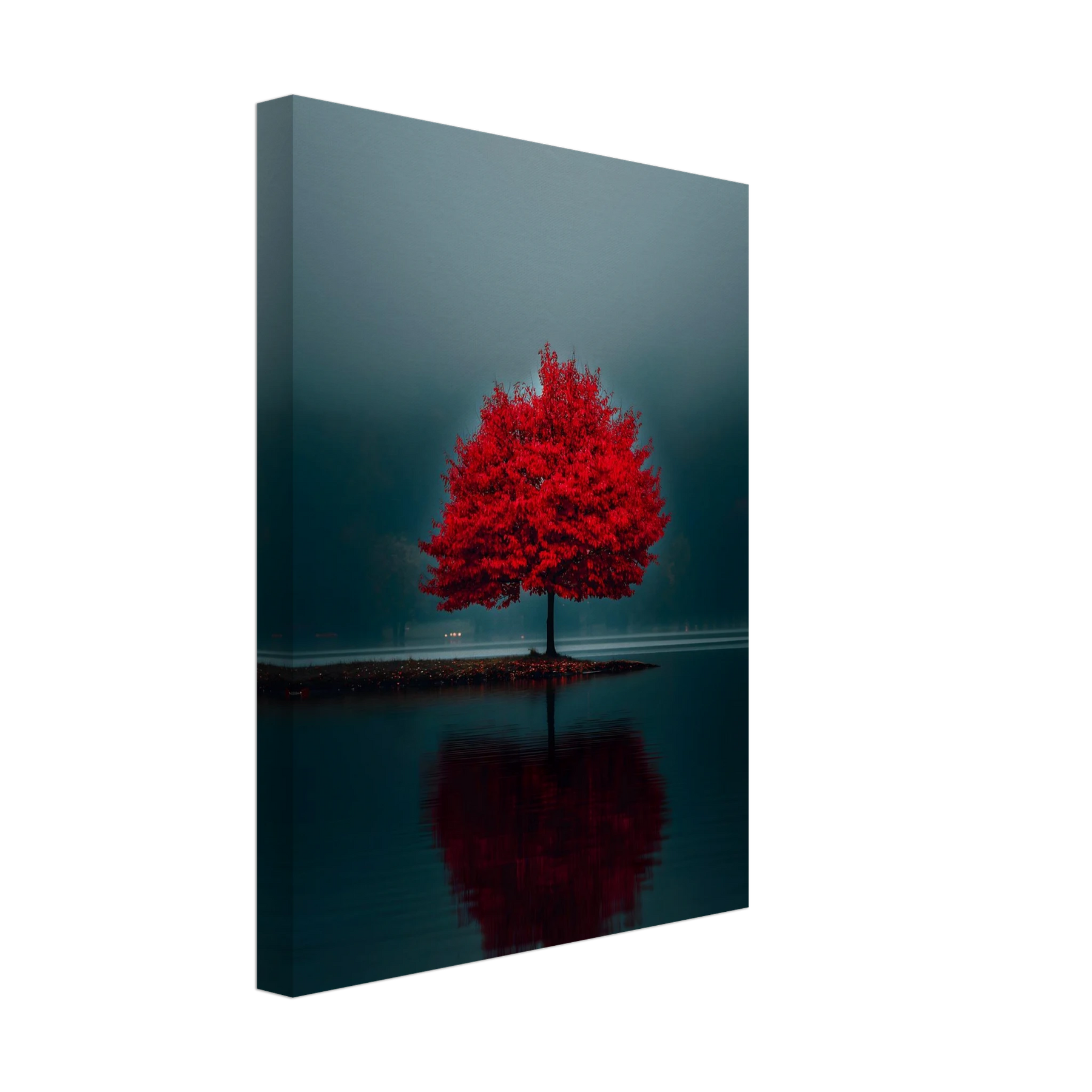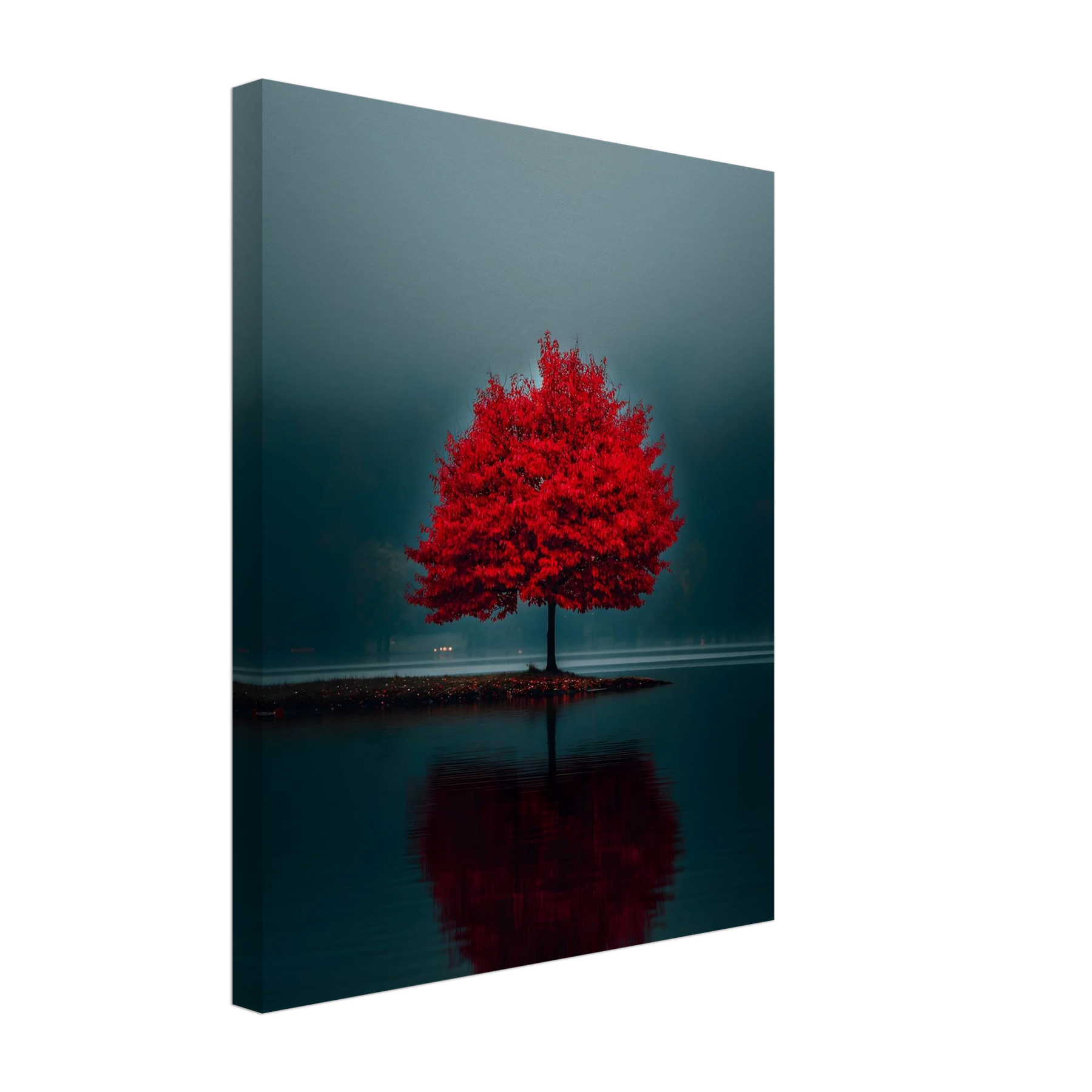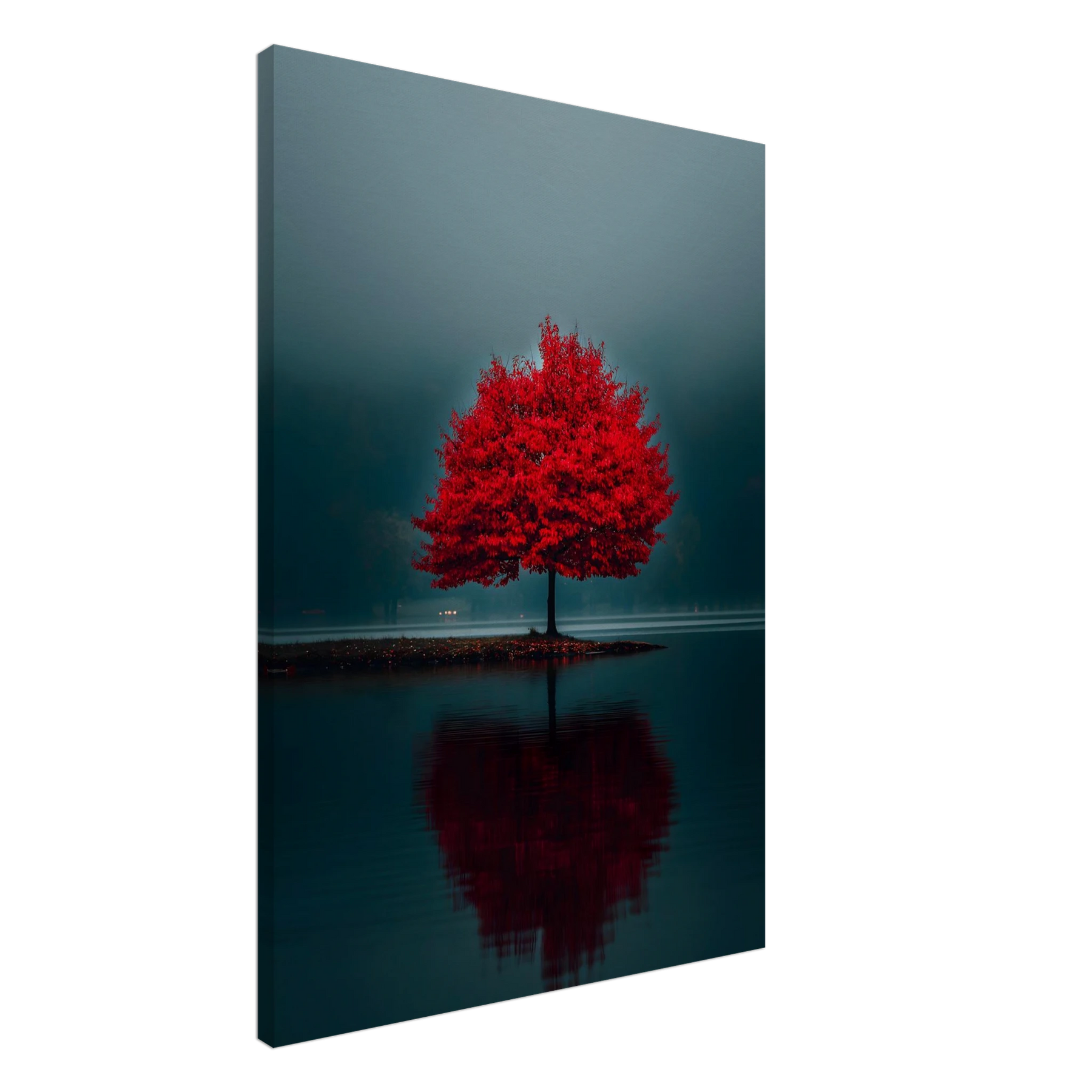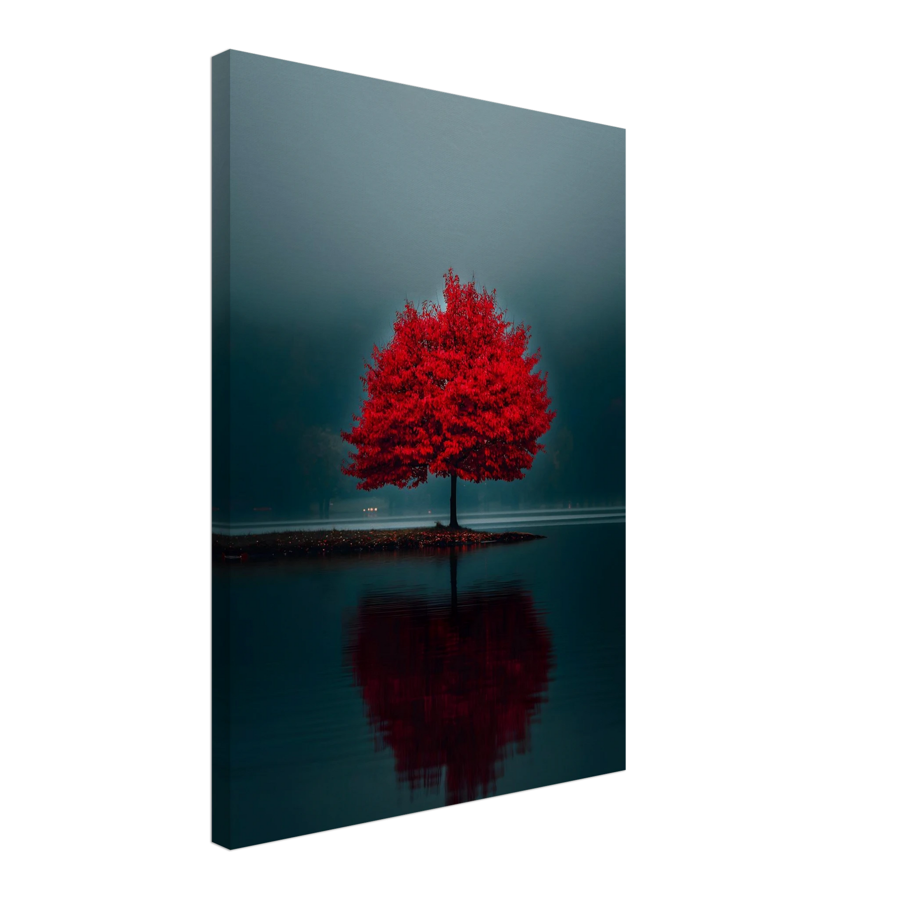 Ett rött träd i höstens dimma fångar blicken. Färgen lyser upp det mörka och skapar en känsla av både ensamhet och skönhet.