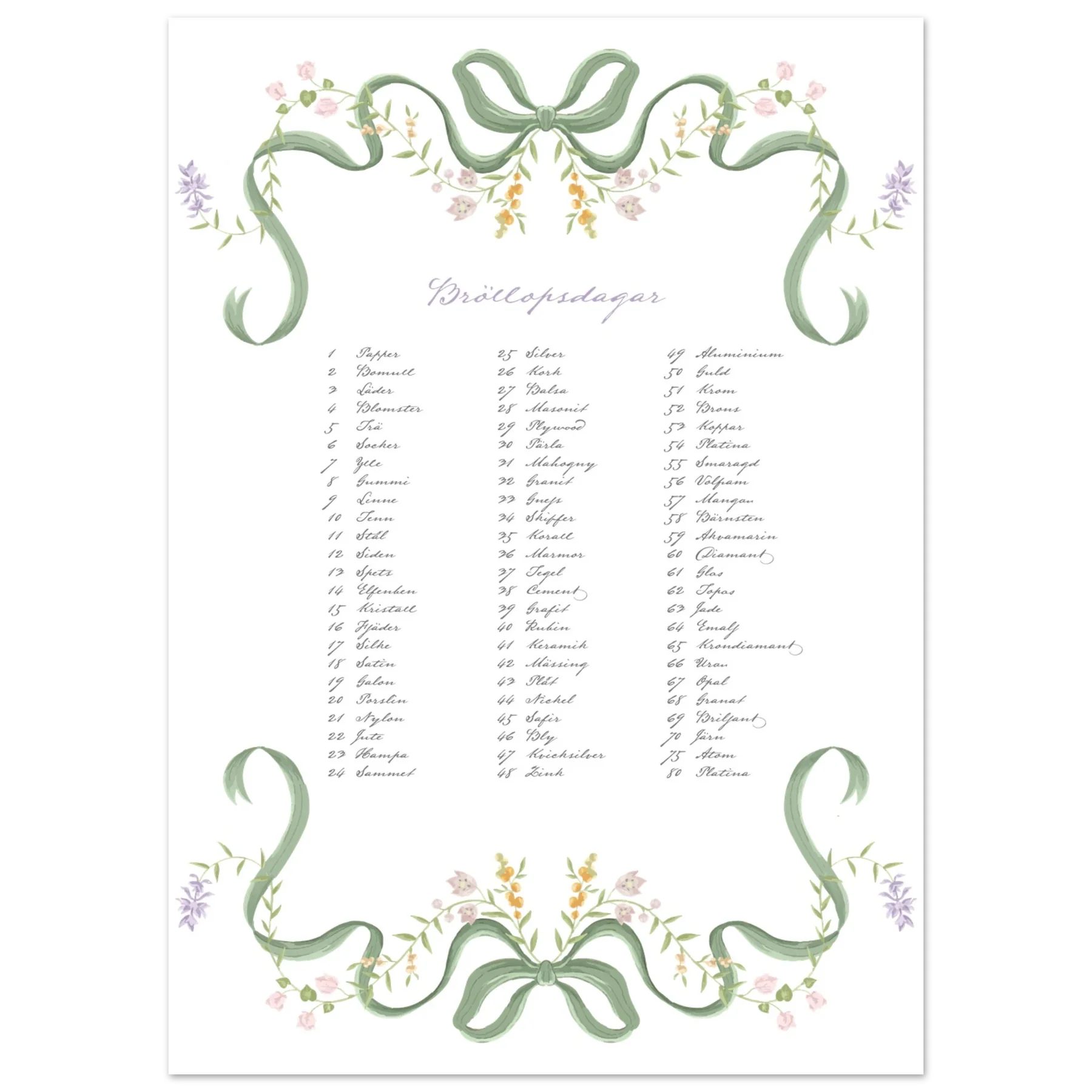 Celebrate every year together with this elegant poster featuring all wedding anniversaries from 1 to 80 according to Swedish tradition. The clean and readable layout makes it easy to see which material or symbol corresponds to each year – from Paper to Platinum. This poster is perfect as a gift for newlyweds, for anniversaries, or as stylish home décor, serving as a beautiful reminder of love growing stronger through the years.