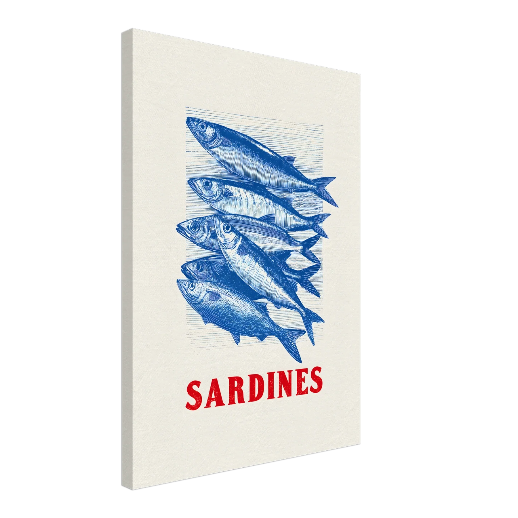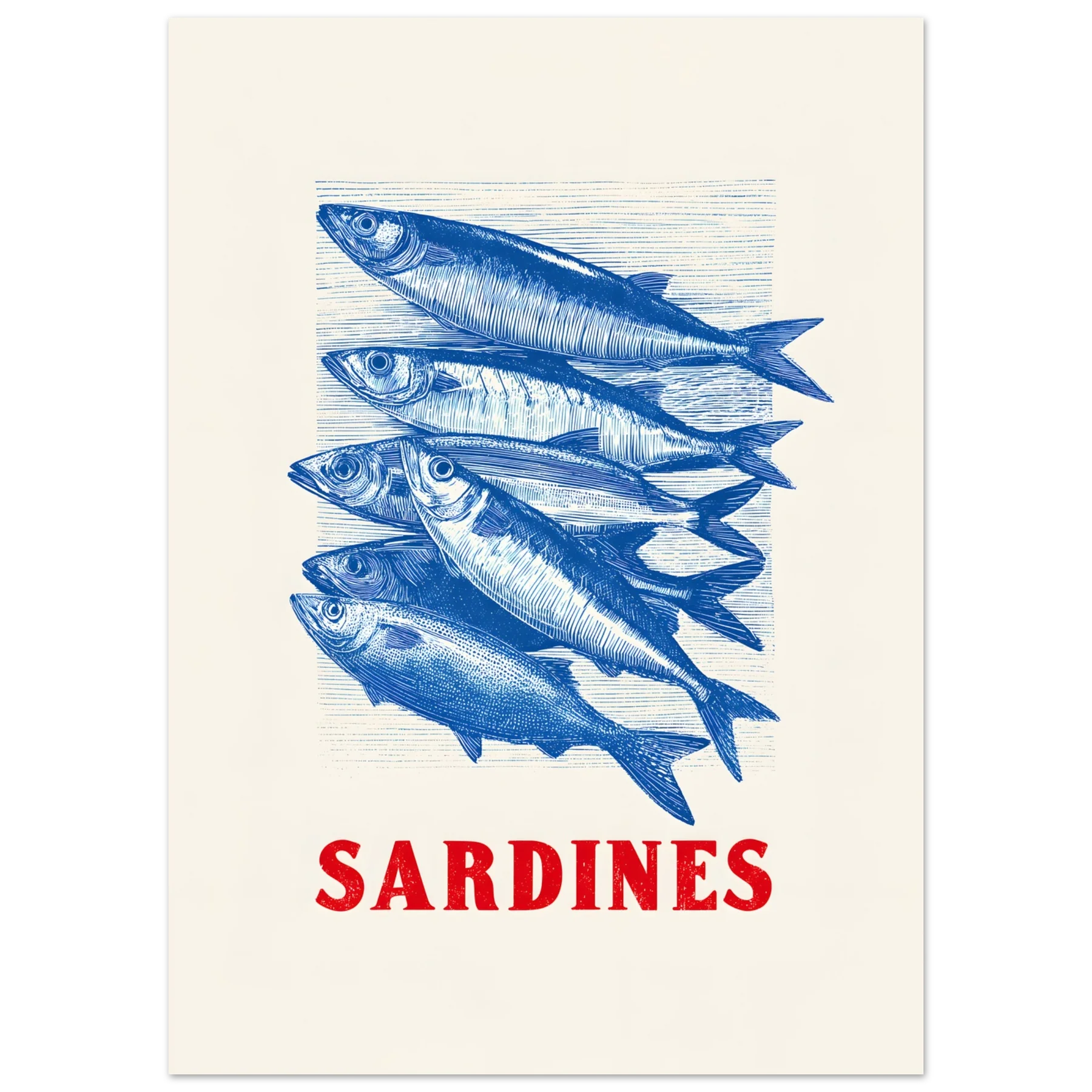 En lekfull och färgstark illustration i blå toner med en burk sardiner och röd text Sardines. Kontrasten mellan det blå och röda skapar energi och ett tydligt visuellt statement. Postern har en retroinspirerad känsla och fungerar lika bra ensam som tillsammans med övriga motiv i serien.