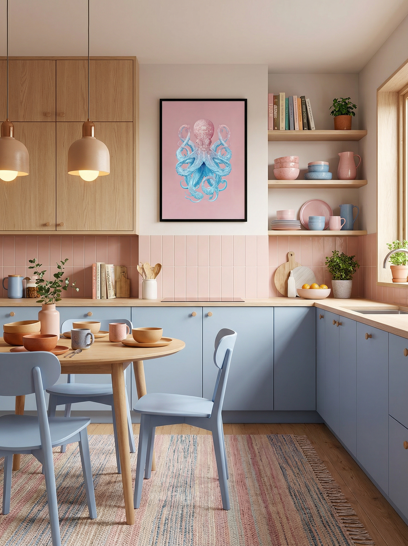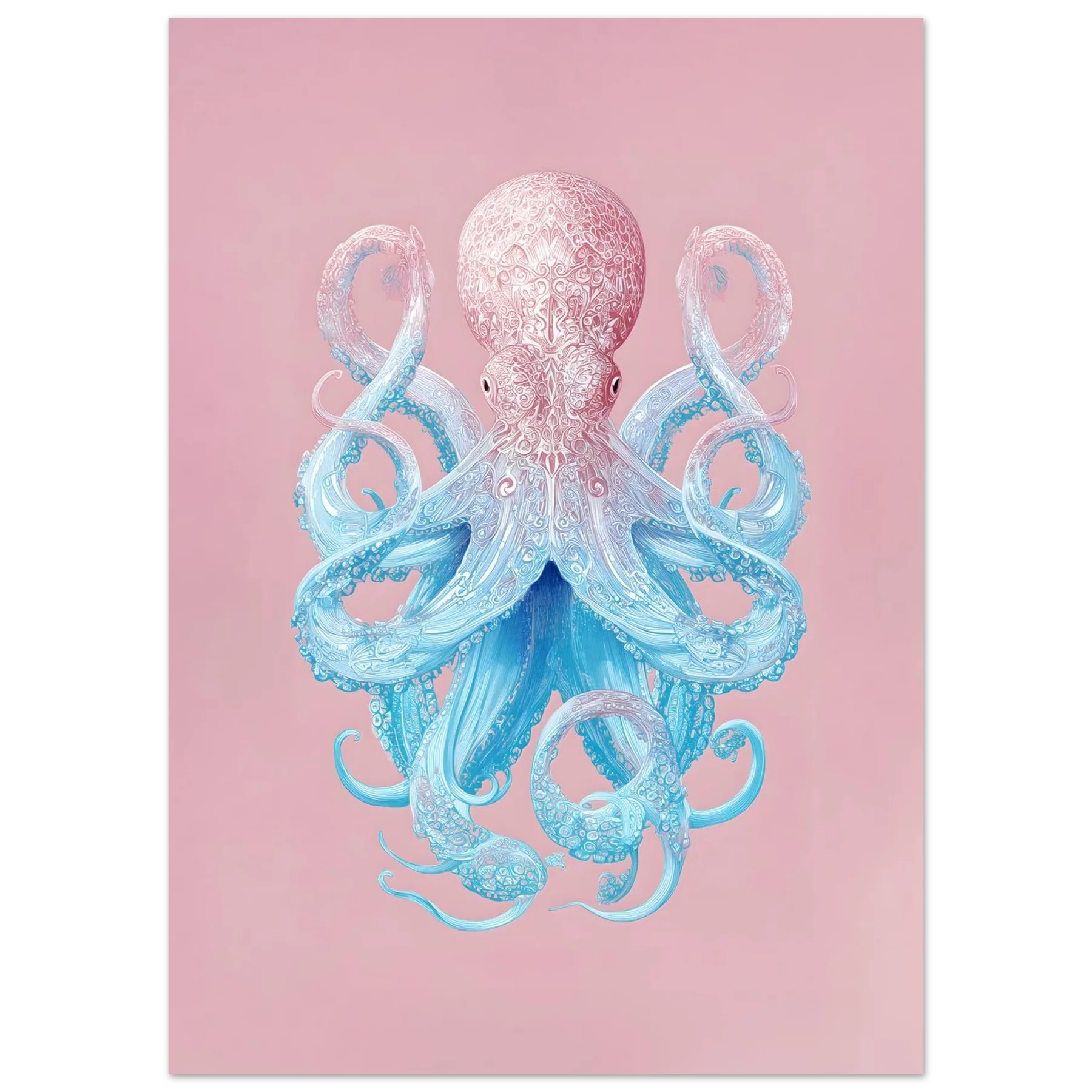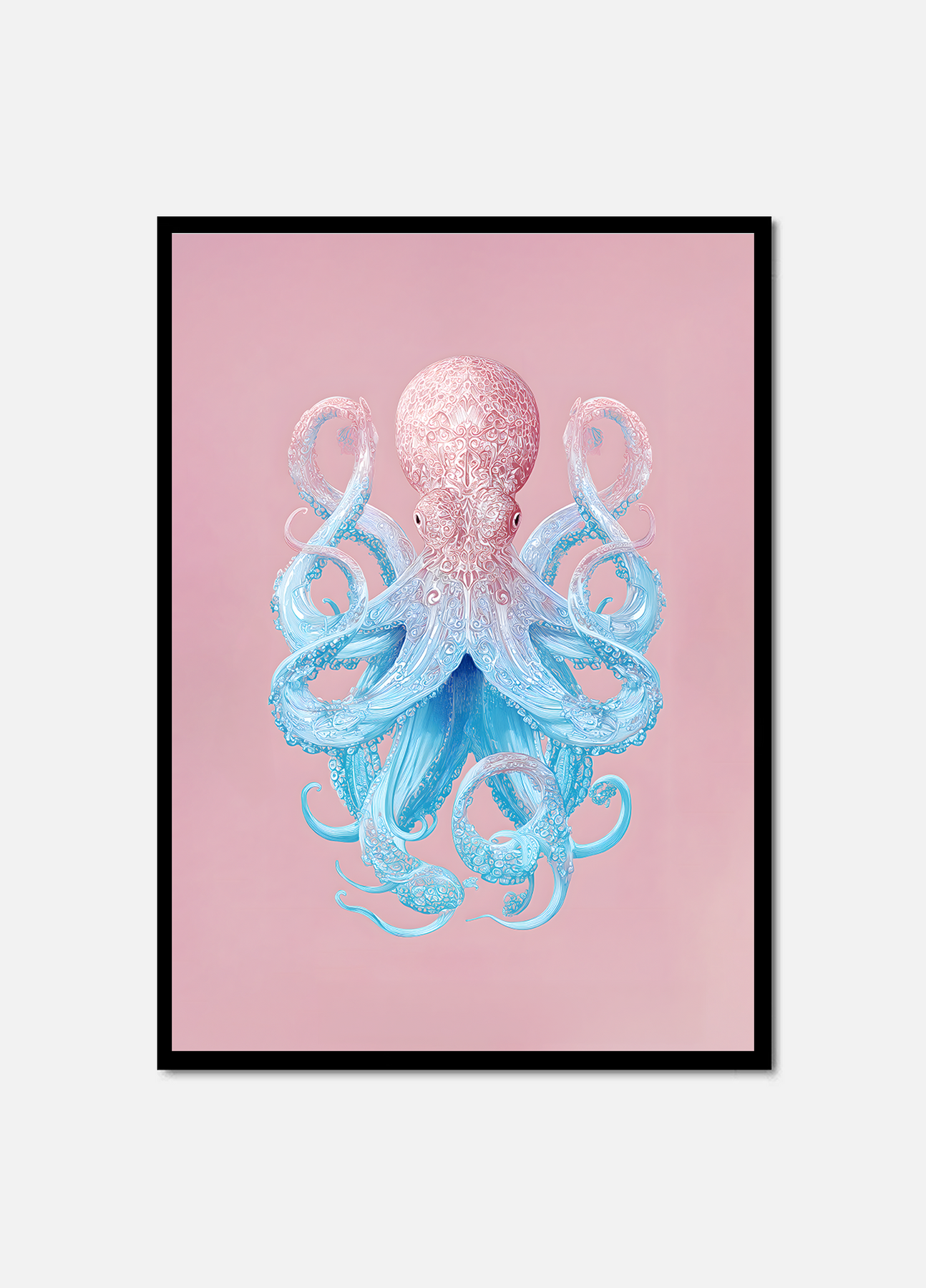 Möt vår lekfulla bläckfisk med en mjuk gradient från blått till rosa mot en varm, rosa bakgrund. Denna charmiga och färgstarka illustration sprider glädje och energi, och passar perfekt i köket eller barnrummet för att ge väggen en livfull och inbjudande touch. Bubblegum Octopus är ett motiv som kombinerar havets magi med en modern, lekfull design som sätter färg på rummet.