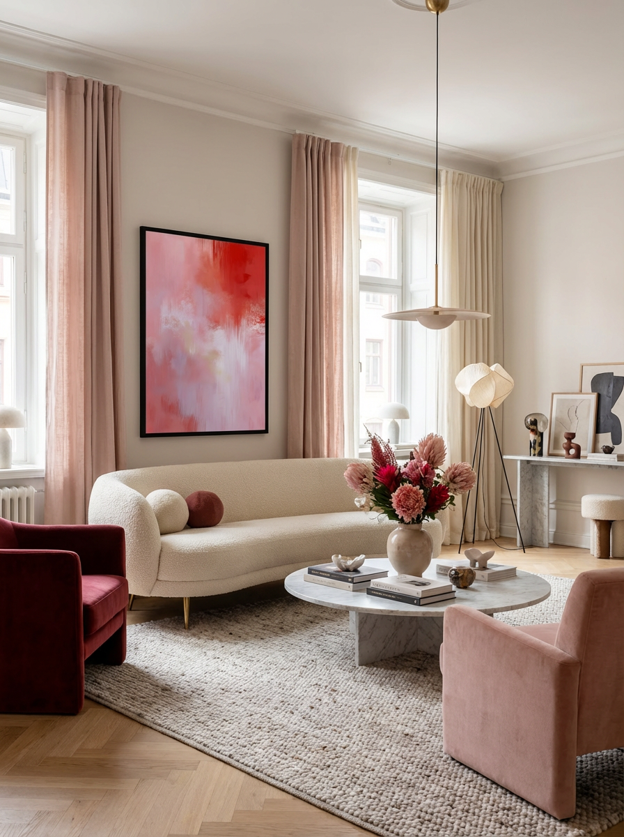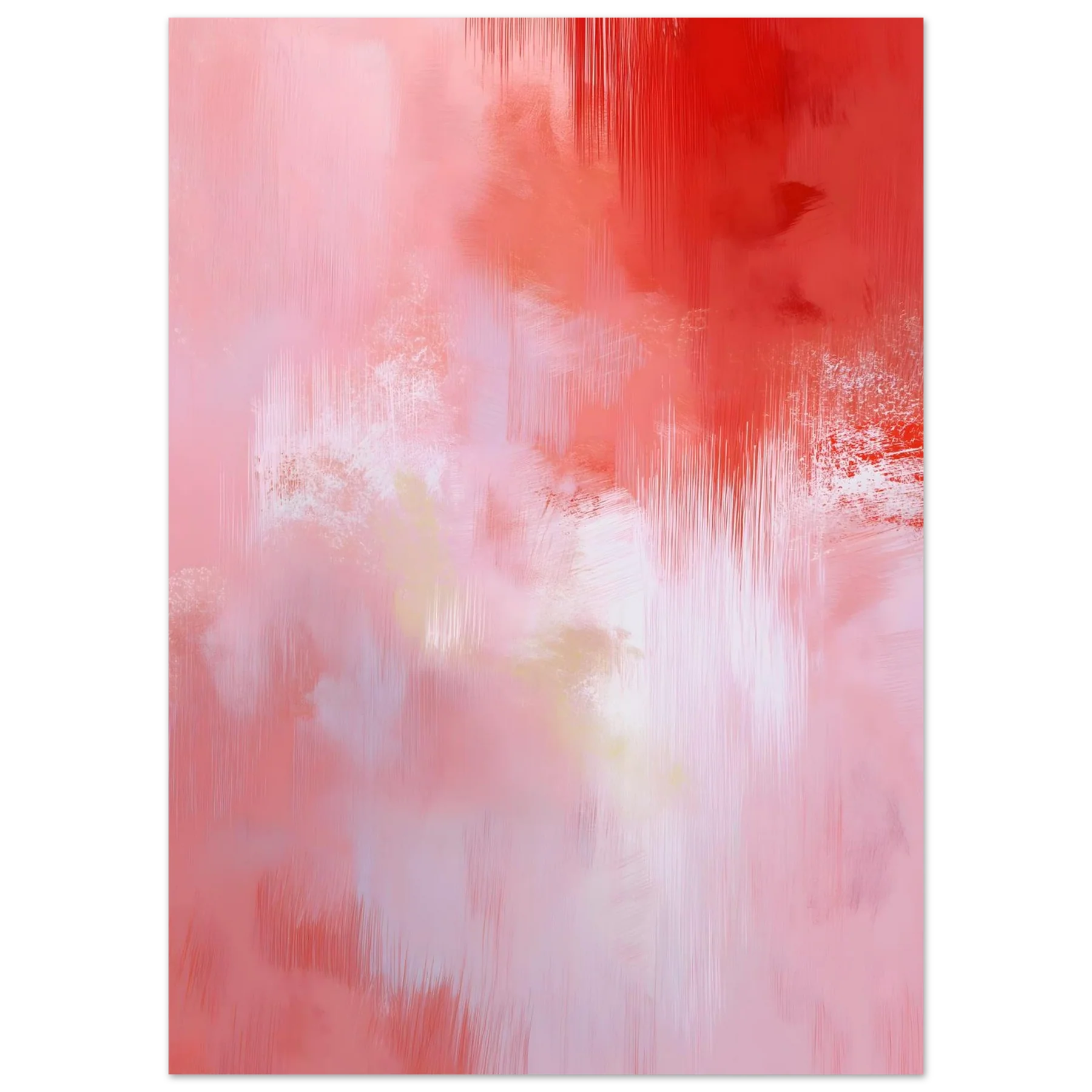En modern abstrakt komposition där djupa röda toner möter mjuka rosa nyanser och skapar en känsla av lugn energi. Motivet passar perfekt i ett modernt hem där man vill addera färg utan att störa harmonin.